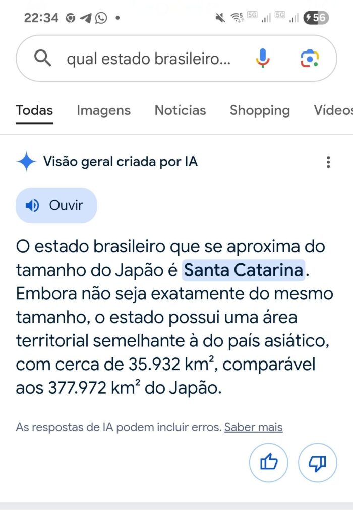Quando perguntado à IA do Google, a Gemini, qual estado brasileiro possui território igual ou mais próximo ao território japonês, a resposta foi a que pode ser vista na imagem abaixo: