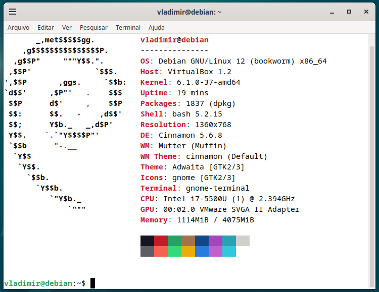 A imagem acima mostra a versão – OS – Debian 12 x86_64, a distro original ou Debian puro, instalada em uma máquina virtual dentro de um Linux Mint em um laptop Lenovo G40-80. Notem que a versão do kernel é a 6.1.0.37-amd64, que foi atualizada trinta e sete vezes (a dezena final da numeração do kernel), mas é a mesma versão, diferente do Debian 12, que é a base do Raspberry Pi OS, cuja versão já foi atualizada para 6.12.