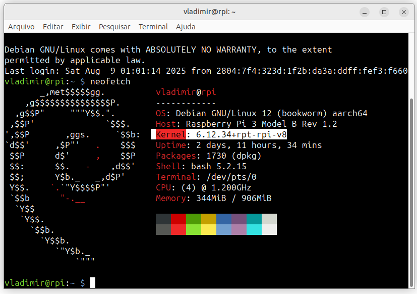 Na imagem acima, a primeira linha – OS – mostra qual a distribuição está instalada e qual sua versão. Reparem que é um Debian 12 ARM (aarch64) Na segunda linha – host – indica o equipamento onde o sistema está instalado, enquanto na terceira linha – kernel – mostra a versão do kernel. Reparem que a versão é a 6.12.34.